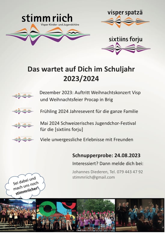 Anfang Juni durfte sich der Verein [stimm riich] im La Poste bei ausverkauften Haus dem zahlreichen Publikum präsentieren. Geboten wurde eine berührende Uraufführung des Musicals "mutig, mutig", dargestellt und gesungen von den [visper spatzä]. Der Jugendchor [sixtiins forju] zeigte sein Programm, mit dem er am diesjährigen Schweizerischen Kinder- und Jugendchorfestival in Winterthur teilnahm. Die beiden Filme, die während der Corona-Zeit entstanden sind, waren ebenfalls zum ersten Mal auf grosser Leinwand zu bestaunen.