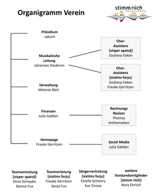 Bei der Zusammenstellung unseres Vorstands achten wir darauf, dass u.a. Eltern aus beiden Chören in die Vereinsarbeit eingebunden werden. Somit ist gewährleistet, dass im Sinne der Kinder und Jugendlichen gehandelt wird. Seit der Vereinsgründung sind auch zwei Sänger-Vertreter/-innen aus dem Jugendchor [sixtiins forju] Teil des Vorstands.